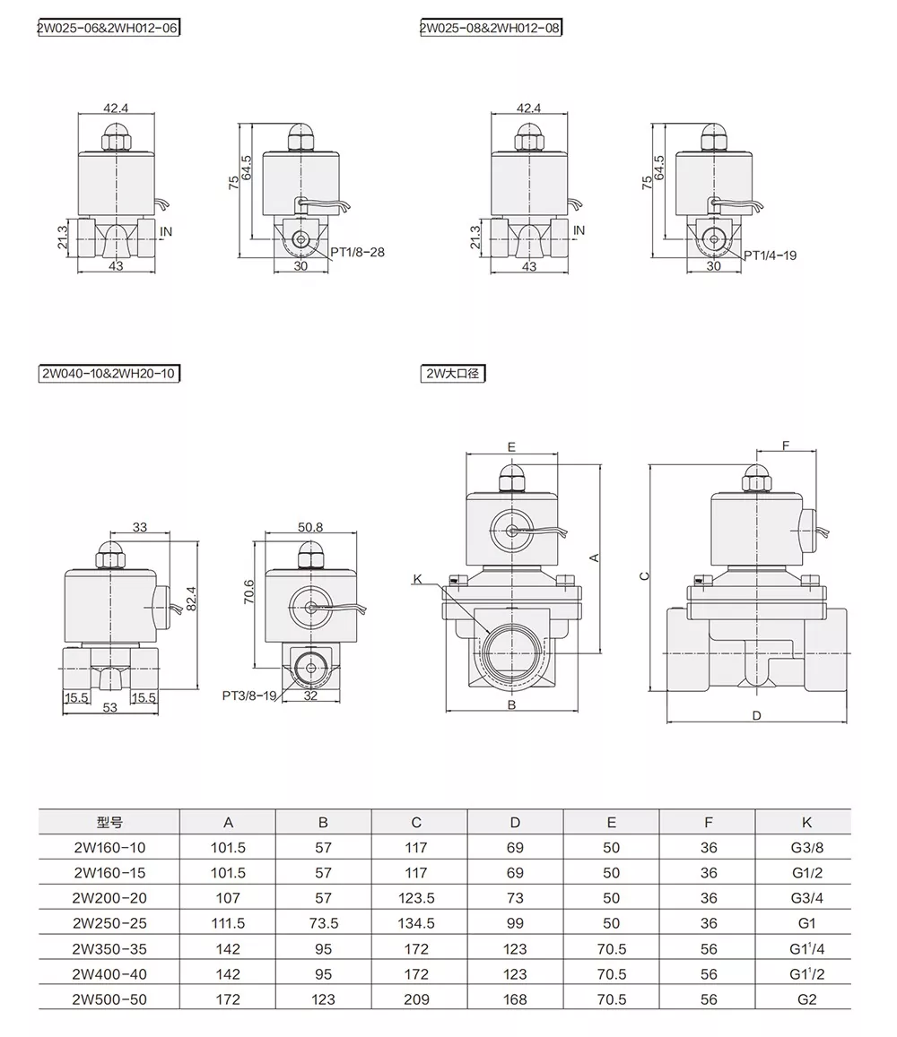 ② Големина на отворот – Код на модел од серијата 2W (16mm–50mm)