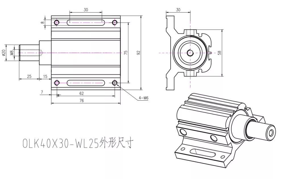 Цилиндарот за позиционирање на машината за гравирање OLK е специјализиран пневматски цилиндар дизајниран за CNC машини за гравирање и глодање. Неговата примарна задача е да ги држи работните парчиња на место или да ги турка во правилна положба пред обработката. Изграден е да биде компактен, цврст и отпорен на прашина и чипови создадени при гравирање.