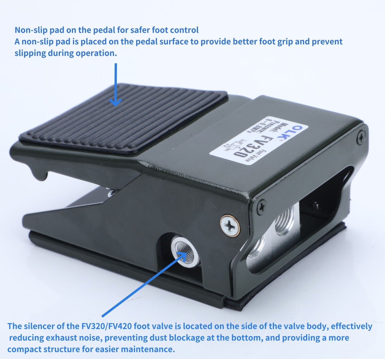 Олк Кина Пневматски производител добар FV320/420 серија на нозе вентил 3 пат 4 пат. FV320/420 Вентилот на педалот за стапало припаѓа на дејството Sinlge. Карактеристиката Смит што влече со лепење и истекување на воздухот.