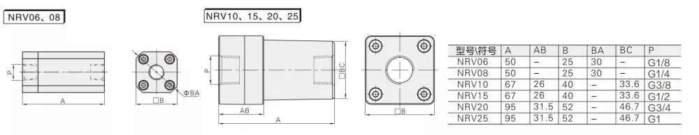 Повратниот вентил NRV има компактен и цврст дизајн, обично изработен од алуминиум, месинг или нерѓосувачки челик. Овозможува течност или воздух да тече само во една насока, спречувајќи го назад протокот и заштитувајќи го системот.