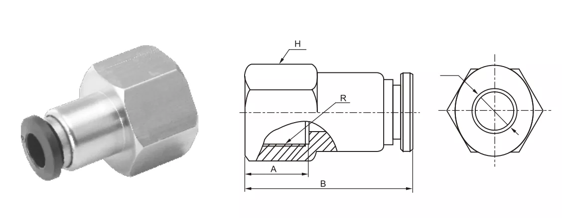 PCF Femaleенски директен притисок во фитинг на цевки и компјутер машка нишка директно притисок во цевката што одговара на сите припаѓаат на основниот притисок за вклопување во типот. Но, PCF е женска R конец директно. Внатрешна нишка се користи за поврзување на надворешните навојни компоненти на навој, а крајот на цевката за вметнување е поврзан со црево. инсталирано покомпактно