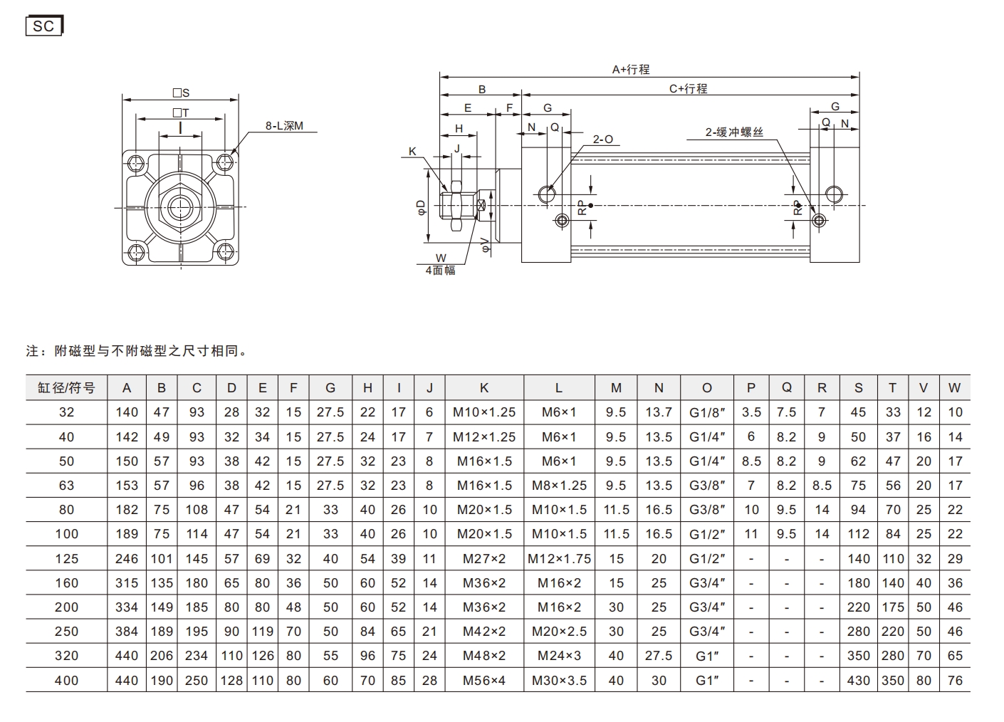 О: Опсег на работен притисок: Во овој опсег, цилиндерот може да започне, да работи и да ги одржува своите перформанси нормално. Опсег на оперативен притисок на воздушниот цилиндри на SC: 0,1 MPa -1,0 MPa (14-145psi); Надминување на овој опсег може да резултира во одложено движење, откажување на заптивката или оштетување.