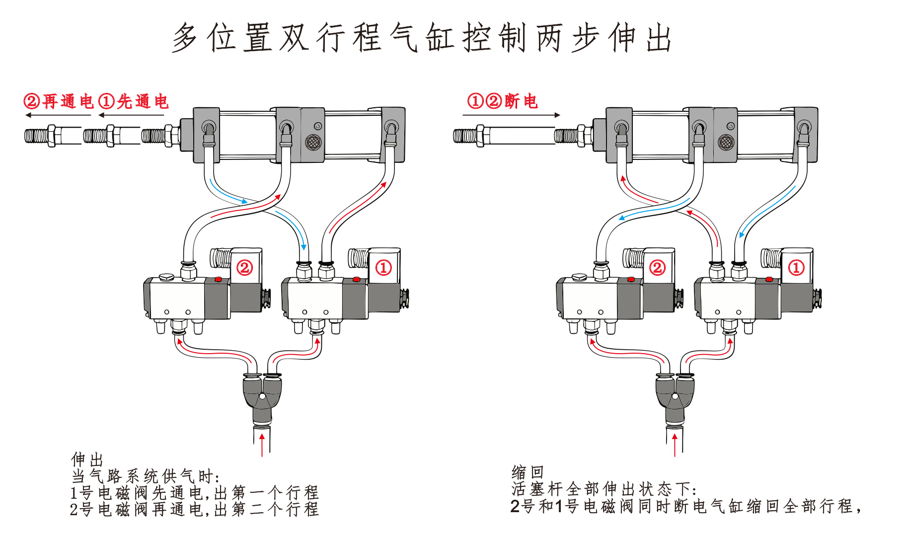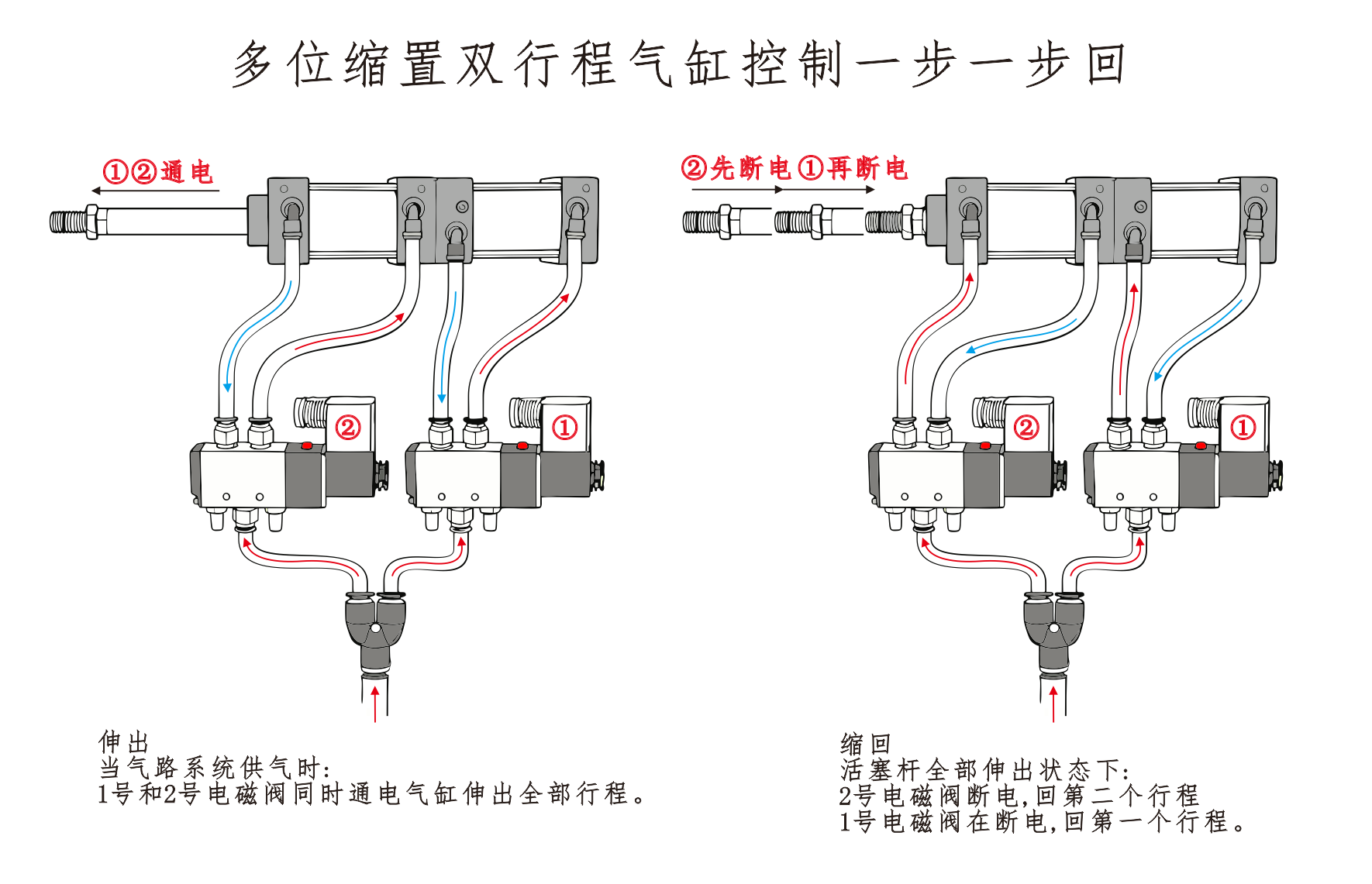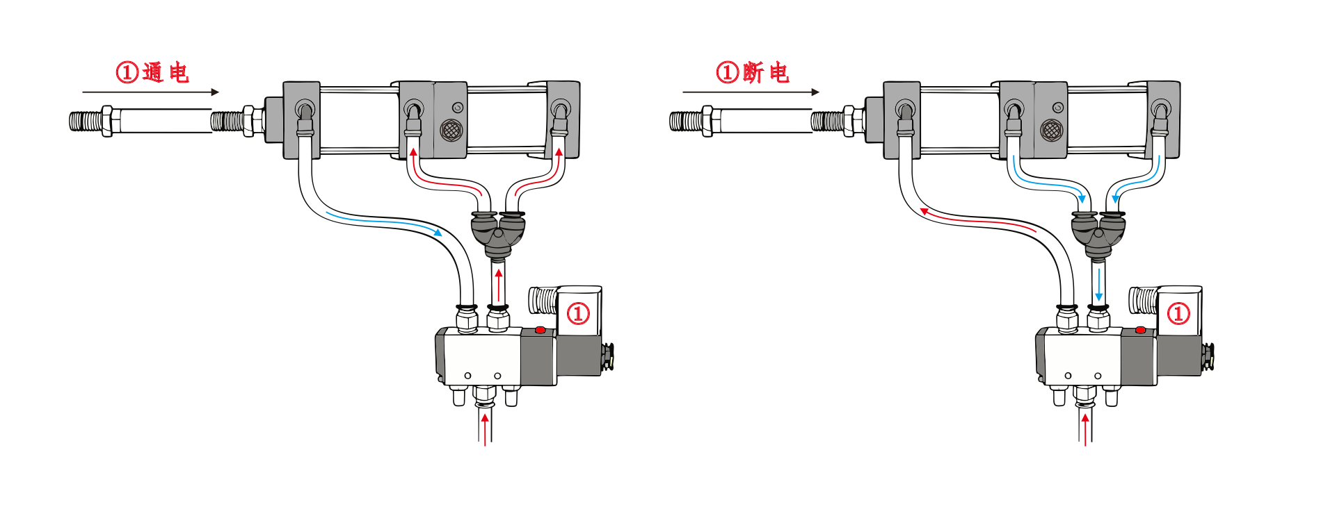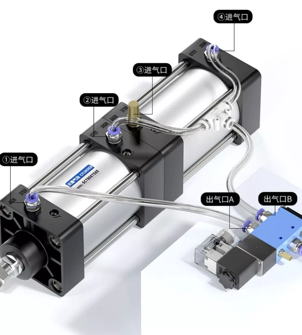 Влезот за воздух на цилиндерот① е поврзан со отворот А на електромагнетниот вентил, а влезот за воздух на цилиндарот е поврзан во серија со портата Б на електромагнетниот вентил. Влезот за воздух на Cylinder③ е поврзан со пригушувач. Кога портата А на електромагнетниот вентил е под напон, цилиндрите остануваат во повлечена положба. Кога портата B е под напон, цилиндрите почнуваат да работат.