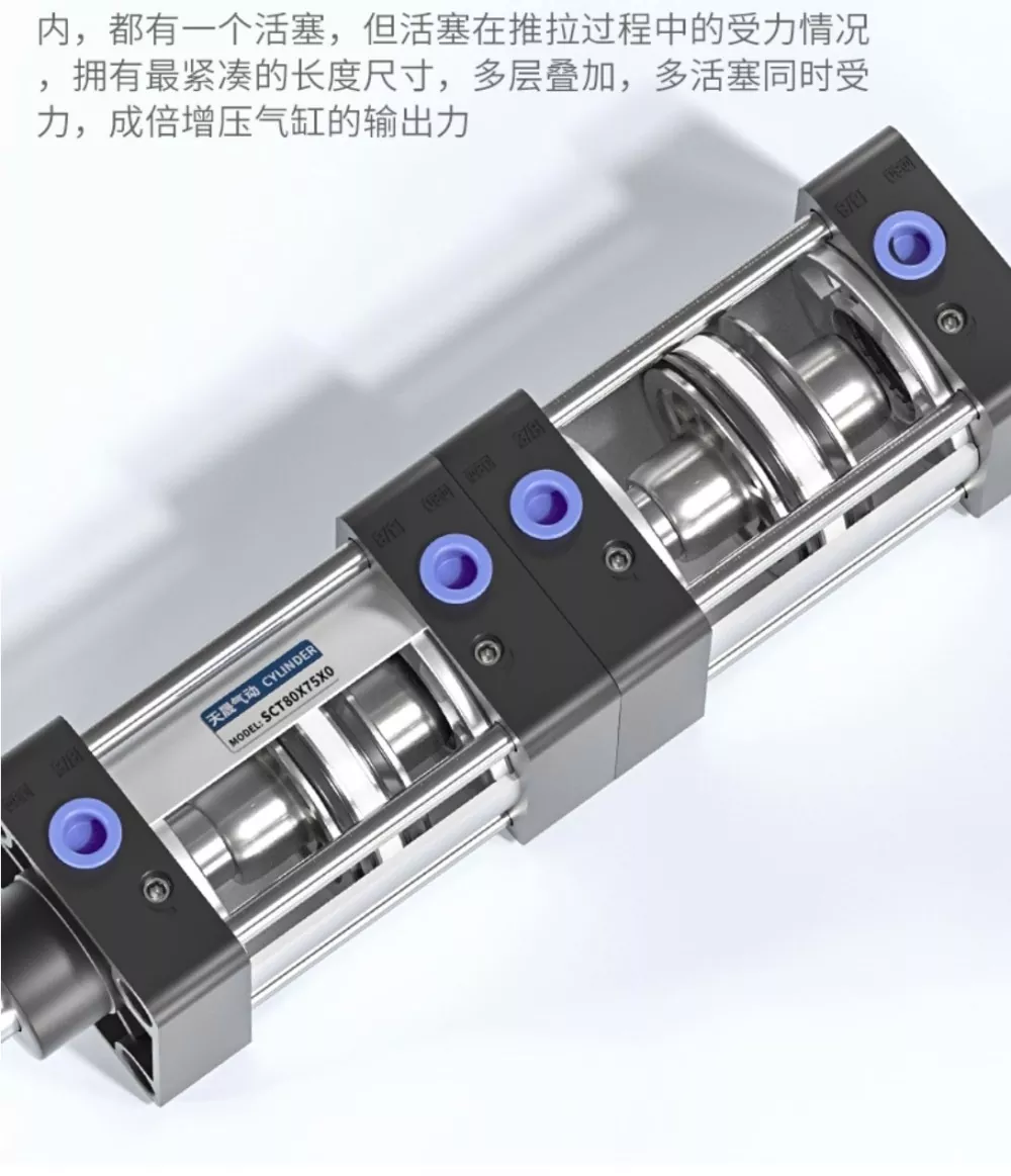 Цилиндарот за врзување SCT има двонасочни YCC заптивни прстени и моќен дизајн со двоен такт, со компактен и префинет изглед кој обезбедува брзо дејство и непречено, стабилно производство. Секој слој од цилиндерот содржи поединечен клип, а за време на процесот на притискање-влечење, повеќе клипови го делат оптоварувањето, дозволувајќи му на цилиндерот да постигне најкомпактна должина додека генерира повеќекратна излезна сила преку неговата повеќеслојна наредена структура. Овој дизајн со двојна сила испорачува посилна моќност, а конфигурацијата со шест заптивки-прстен обезбедува одлични перформанси на запечатување, овозможувајќи му на цилиндерот да држи притисок до 1,4 MPa без истекување.