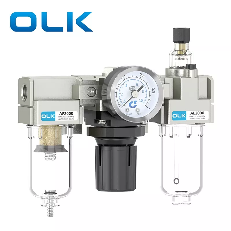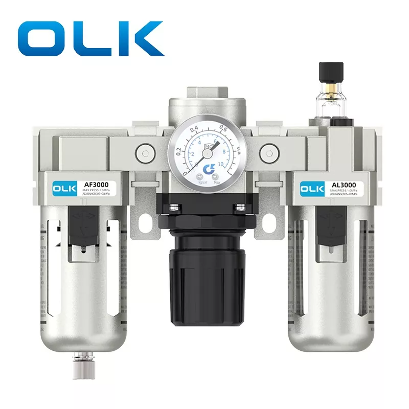 Единицата SMC Type AC FRL (филтер-регулатор-лубрикатор) е пневматска основна компонента која интегрира филтрирање на изворот на воздух, намалување и регулација на притисокот и третман со подмачкување. Обезбедува чист, стабилен и подмачкан компримиран воздух за пневматските системи, а со тоа го продолжува животниот век на пневматските компоненти и ја подобрува стабилноста на системот. Единицата FRL од серијата OLK AC делува како суштински „чувар“ на современите пневматски системи.