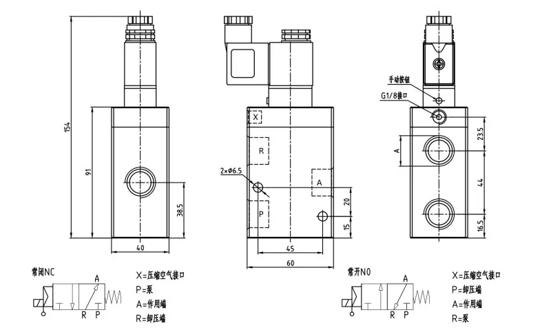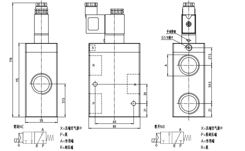 Навојни порта (P, A, R) големини се достапни во G3/8, G1/2 и G1, со компримиран воздушен порта (X) во G1/8.